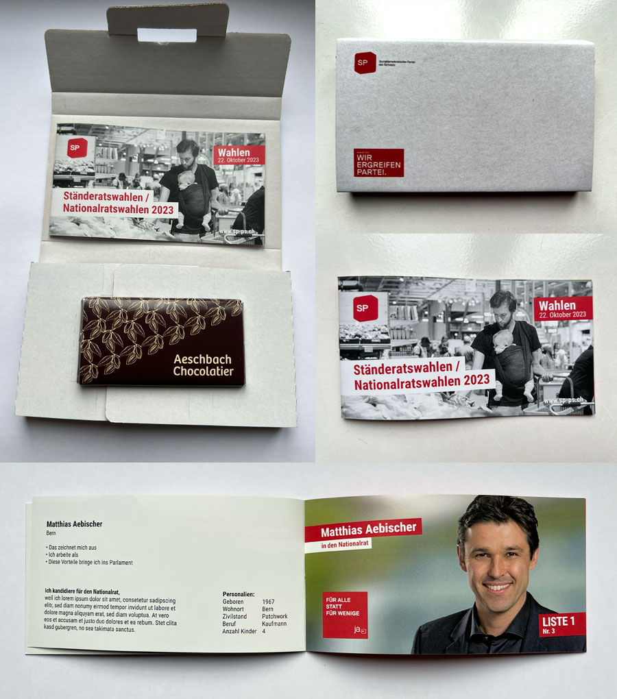 Ihre potentielle Wählerschaft erhält Ihre Botschaft inklusive einer süssen Überraschung in einem persönlich adressierten Päckchen. So wird Ihre Wahlwerbung mit besonders vielen angenehmen Emotionen in Verbindung gebracht und Sie bleiben als Absender garantiert in positiver Erinnerung!